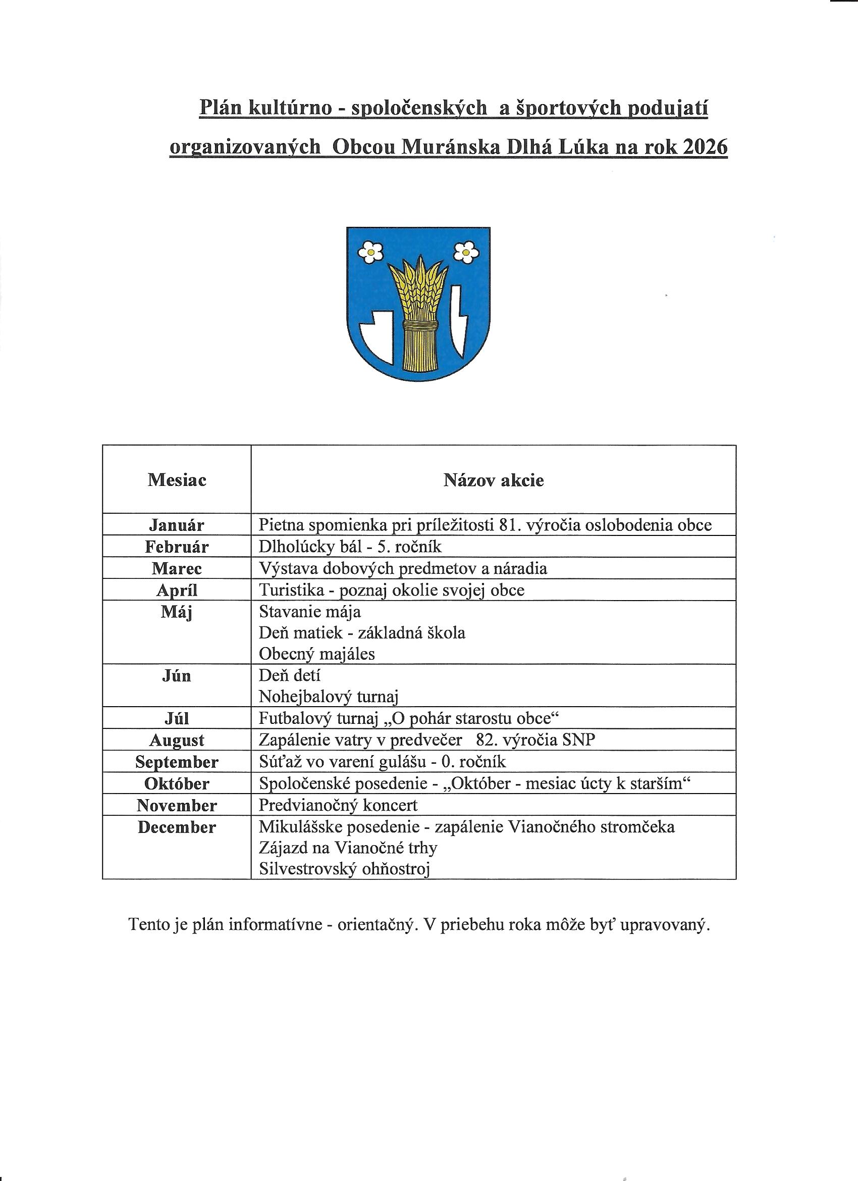 Plán kultúrno-spoločenských a športových podujatí organizovaných Obcou Muránska Dlhá Lúka na rok 2026