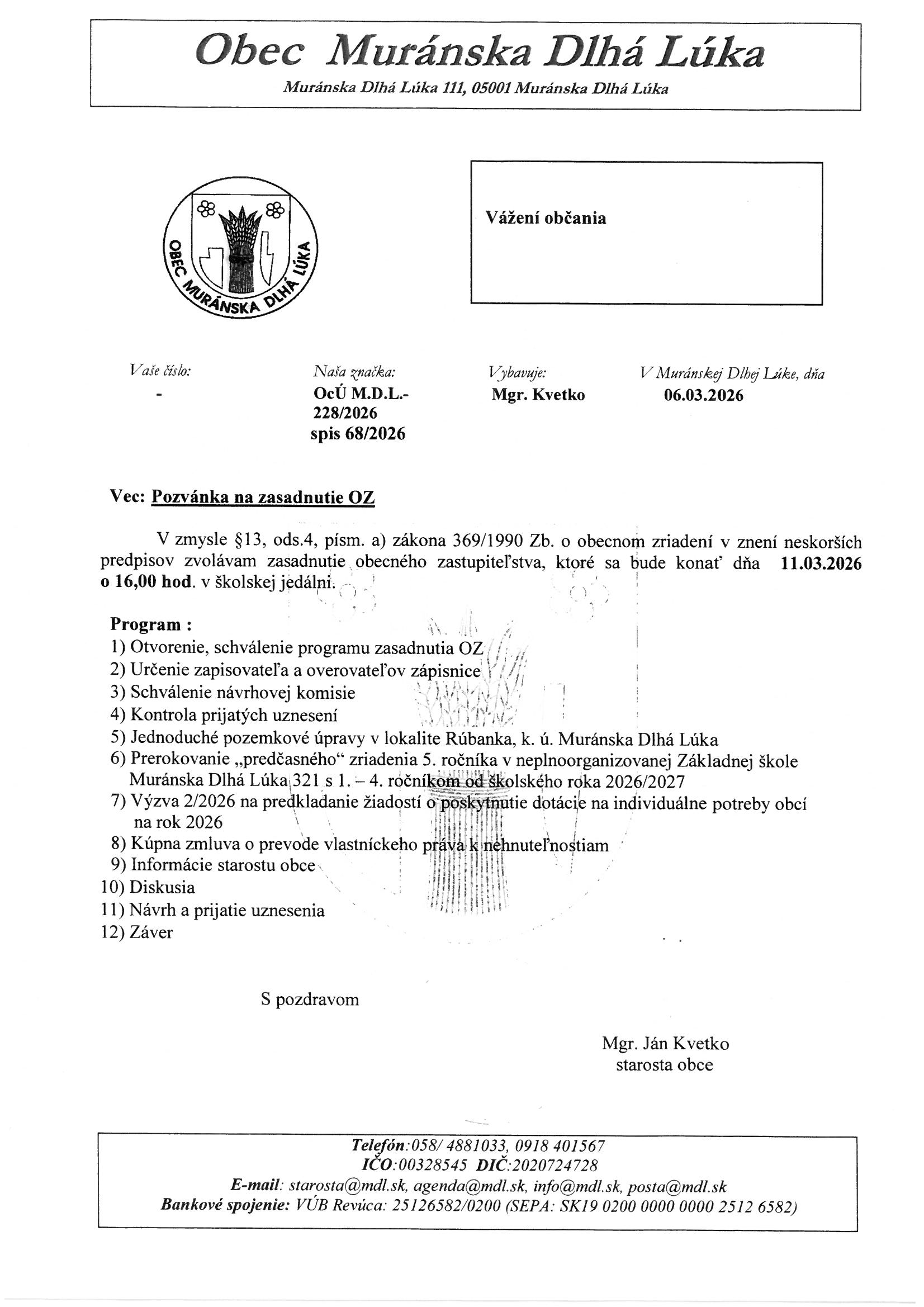 Pozvánka na zasadnutie OZ 11.3.2026