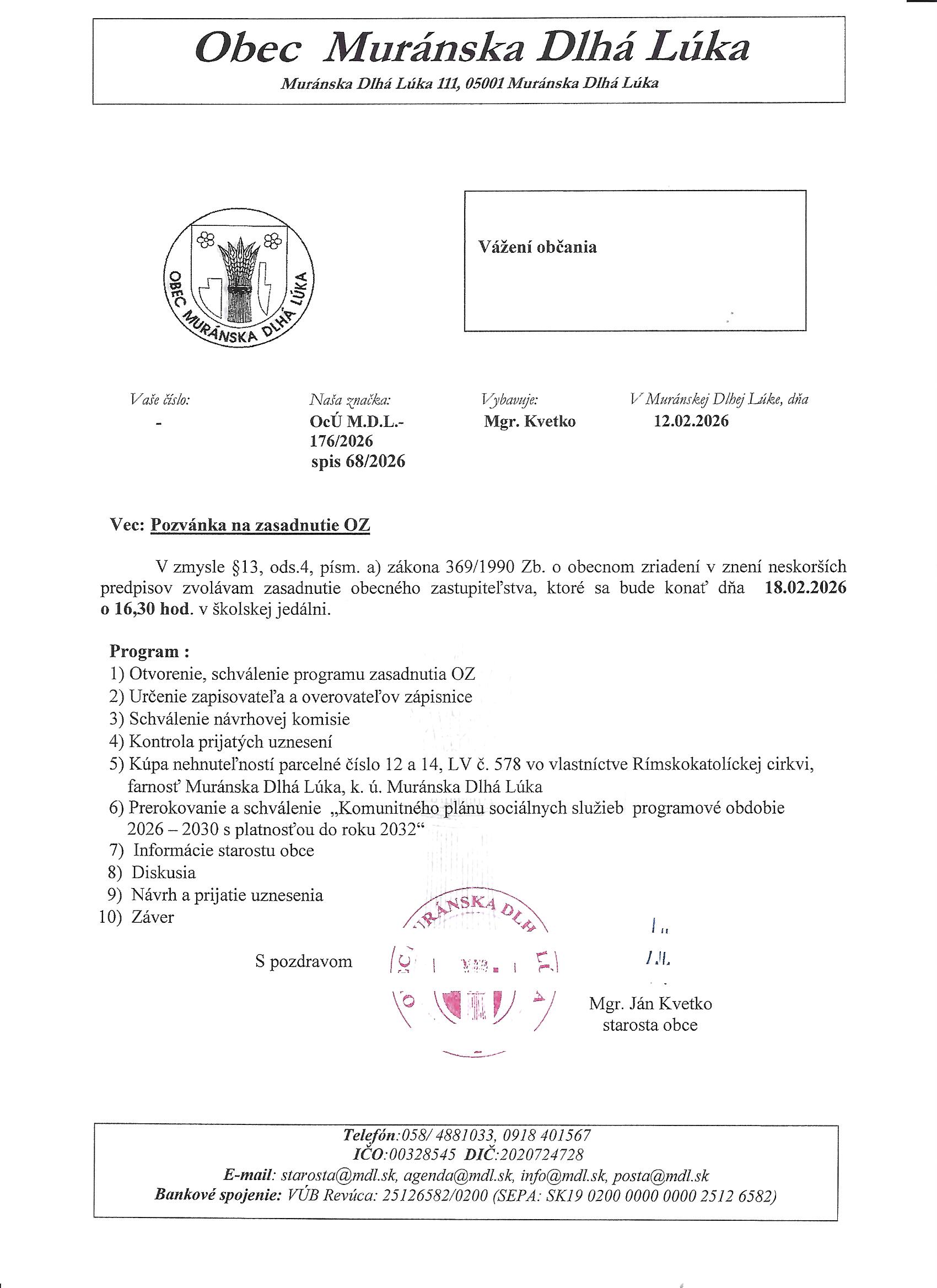 Pozvánka na zasadnutie obecného zastupiteľstva dňa 18.2.2026