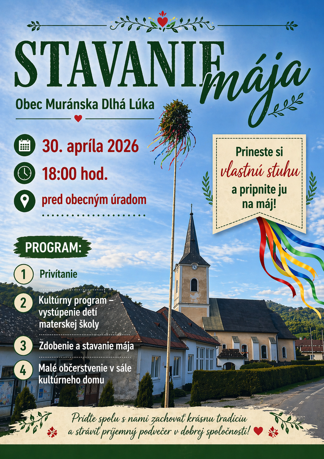 23. 04. 2026 - Obec Muránska Dlhá Lúka Vás srdečne pozýva na Stavanie mája 30.apríla 2026 o 18,00 hod.pred obecným úradom.... >> čítaj viac